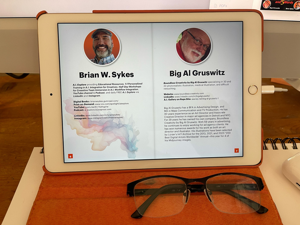 This book was a collaborative effort between Brian W. Sykes and Big Al Gruswitz. Brian had started a short series of one-word prompts that he called "A.I. Elemental" shortly after version 4 first became available. Inspired, Big Al picked up the mantle and began is own explorations. Brian reached out to Big Al with the idea of collaborating on just such a work. During the time of creation - Midjourney added styles to version 4 (4a and 4b), then version 5, and now 5.1. We decided to include the collection of renders created an develop a more comprehensive project. Brian composed the work, laid everything out in Adobe Indesign - and the rest as they say... is history.