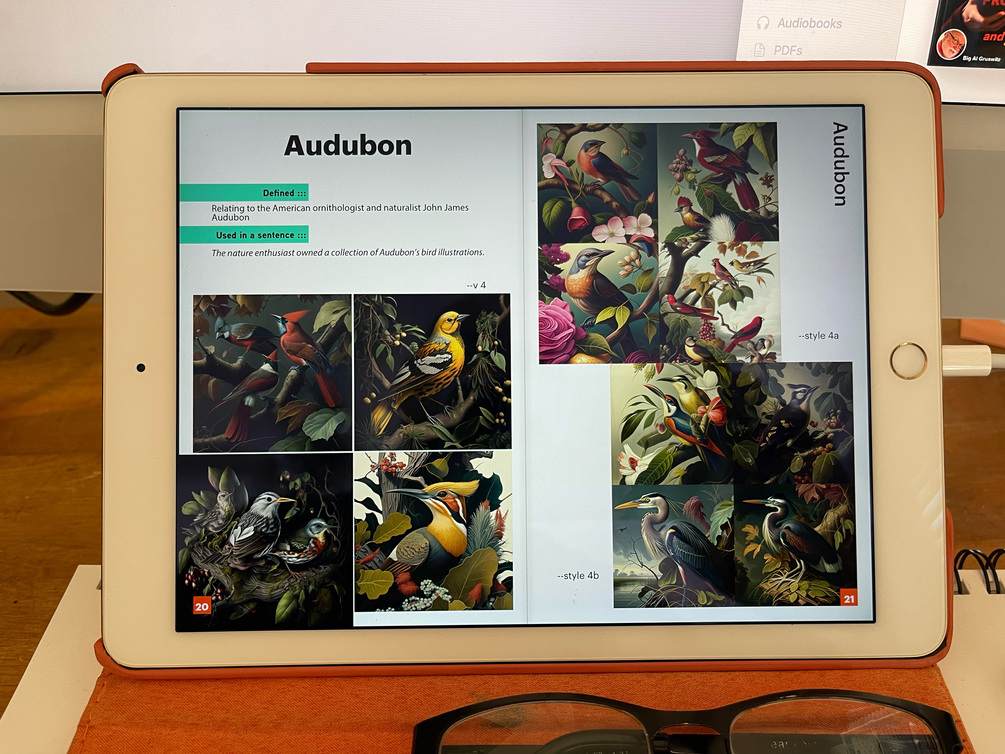 This book is a little bit different. It is one part dictionary, and one part visual word study with Midjourney thru various versions. Each word is defined, used in a sentence and explored as a render in versions 4, --style 4a, 4b, 5 and 5.1